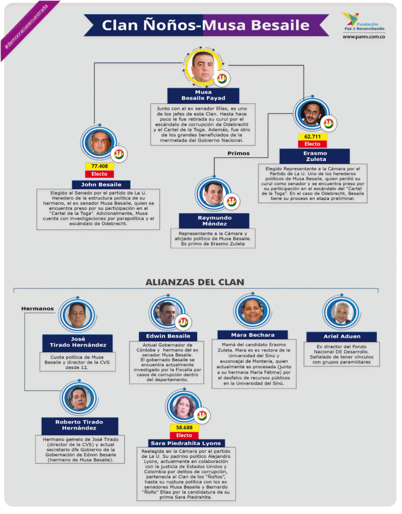 La casa política de los “Noños” se identificaba hasta hace poco como una de las protagonistas en términos del alcance de su poder en la gestión y ejecución de recursos públicos. Estaba conformada por los ex congresistas Bernardo “Ñoño” Elías, Musa Besaile Fayad; y los actuales representantes Eduardo José Tous de la Ossa y Erasmo Zuleta Bechara; todos del Partido de la U. También se destacaba al gobernador electo de Córdoba en 2016 Edwin Besaile Fayad, hermano del Senador Musa Besaile, temporalmente separado de la gobernación debido a procesos por corrupción en su contra.