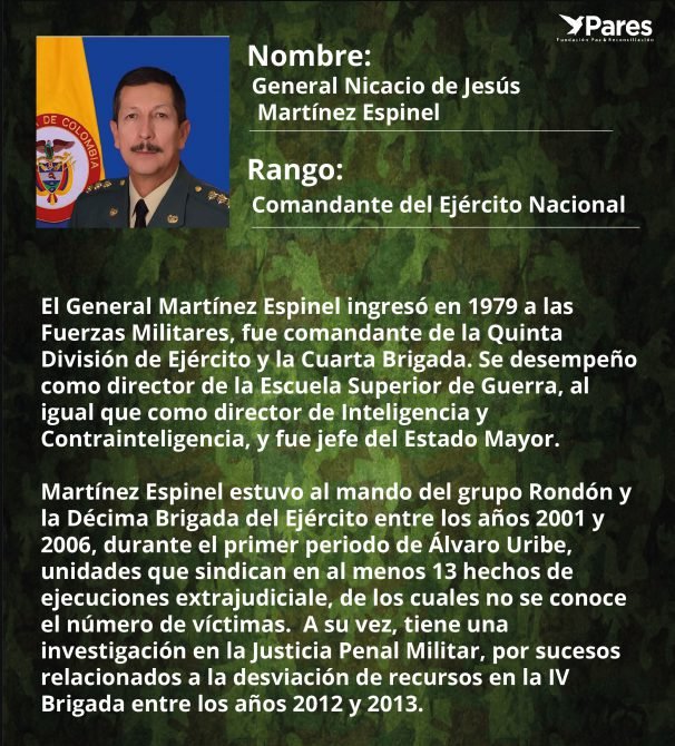 El comandante del Ejército Nacional, Nicacio de Jesús Martínez Espinel, estuvo al mando, entre octubre de 2004 y enero de 2006, de una brigada señalada por la Fiscalía General de por al menos 283 supuestas ejecuciones extrajudiciales.