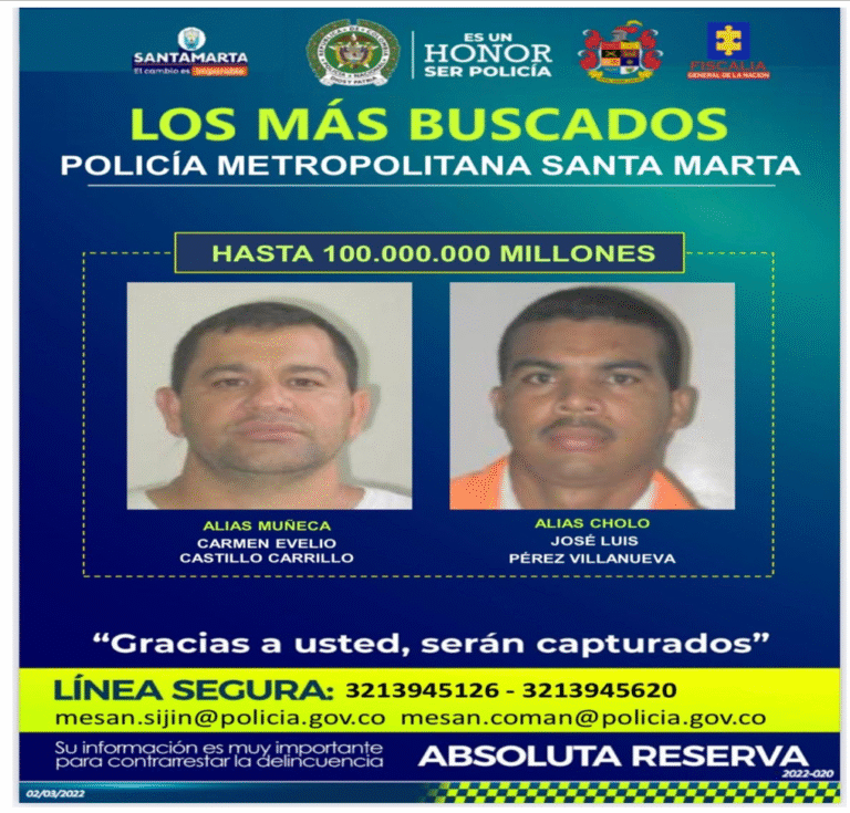 Ayúdenos a identificar a los delincuentes más buscados por@PoliciaStaMarta. Hasta 300 millones de recompensa. En:https://twitter.com/PoliciaStaMarta/status/1533846708441997313/photo/1
