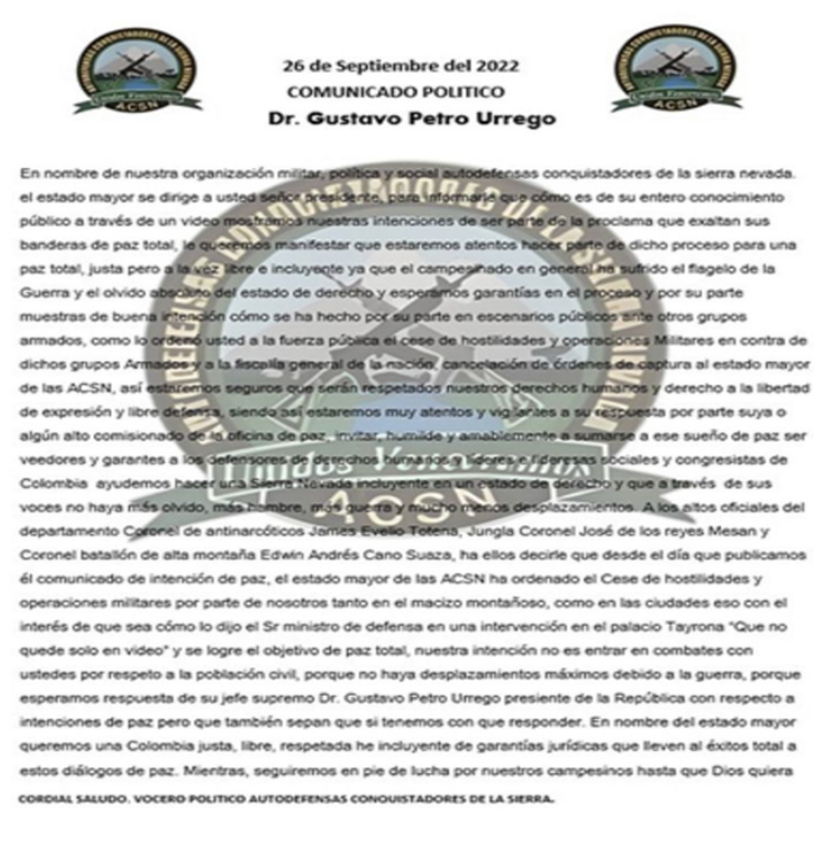 El día 26 de septiembre del presente año se vivió un hecho que marcó la historia de este grupo, pues le solicitó de manera oficial, mediante un comunicado (Foto No. 2), al presidente de la República, ser parte de la política de Paz Total que busca implementar con las organizaciones delincuenciales del país. Esta es la viabilidad que ven muchos miembros de grupos armados para reincorporarse a la vida civil.