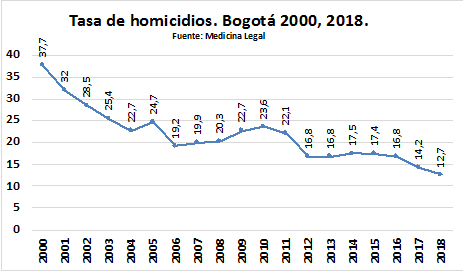 En términos de resultados, hay que resaltar que se mantuvo la tendencia a la baja de los homicidios, que viene desde el año 2011, poniendo en cuestión la disculpa teórica del “piso de cristal” de los gobiernos anteriores al de Gustavo Petro, que aseguraban que la tendencia había llegado a su punto más bajo, con cerca 20 homicidios por cada 100.000 habitantes y que era casi imposible seguir disminuyendo, dadas las amenazas de violencia y delincuencia que tenía la ciudad.