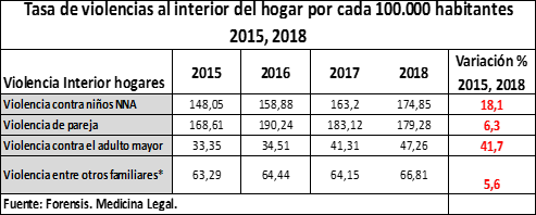 Según los datos de Medicina Legal, las distintas violencias al interior de los hogares se incrementaron. De acuerdo con los reportes de los exámenes médico legales, en materia de violencia en contra de los niños, niñas y adolescentes, se pasó de una tasa de 148 casos por cada 100.000 habitantes en 2015 a 174,8 en 2018, es decir se registró un incremento del 19%. Con relación a la violencia en contra de la pareja, el incremento de la tasa fue del 6,3%, contra el adulto mayor del 41,7% y contra otros familiares el incremento fue del 5,6%, como se puede ver en el siguiente cuadro: