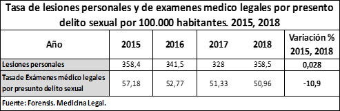 Por otro lado, las lesiones personales permanecieron estables y los exámenes médico legales por presunto delito sexual disminuyeron en un 10,9%, como se puede ver en el siguiente cuadro:
