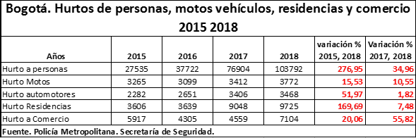 Como se puede ver en el siguiente cuadro, entre 2015 y 2018, los hurtos a personas, motos, vehículos, residencias y a comercio han crecido, y no sólamente durante este periodo, sino en el último año (comparativo 2017, 2018) donde los hurtos a personas crecieron en un 35%, comercio en un 56%, motos 10,5%, residencias 7,48 y automotores 7,5%. En este caso, se puede definir el 2017 como la línea base desde la cual se pueden evaluar los hurtos hacia delante con cierta confiabilidad, teniendo en cuenta que de la mayoría de estos delitos existe una cifra oculta cercana la 60%.