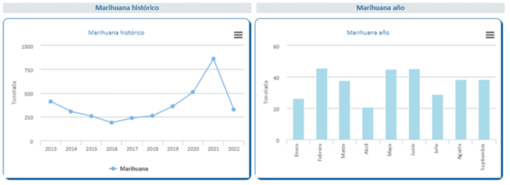 El panorama a nivel nacional con el fenómeno del microtráfico y el narcomenudeo es bastante preocupante, pues son muchas las estructuras delincuenciales que se han identificado como expendedoras de estupefacientes en muchas aglomeraciones y áreas metropolitanas, afectando la seguridad y convivencia. La Policía Nacional, en la realización de operativos, ha logrado golpear a varios grupos delictivos y en la mayoría de casos ha podido desmantelar a las estructuras o capturar a los cabecillas de las mismas. Según las estadísticas presentadas por el Ministerio de Justicia y del Derecho, a nivel nacional las incautaciones para 2022 han disminuido siendo 2021 el año en que se han presentado más operativos con respecto a estas, y siendo la marihuana la sustancia psicoactiva que más ha sido incautada, tal como se muestra en el siguiente gráfico: