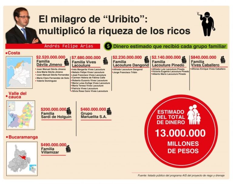 En definitiva, los más ricos salieron beneficiados y hasta el momento no se tiene claridad si los dineros -que salieron del bolsillo de todos y todas las colombianas-, fueron devueltos al Estado, o si se pactó algo adicional con dichas familias. El responsable directo fue Arias, entre otros funcionarios como el ex viceministro de Agricultura, Juan Camilo Salazar; el exgerente del Incoder, Rodolfo Campo. Pero, en todo caso, el campesinado y los dueños de empresas pequeñas fueron los principales afectados