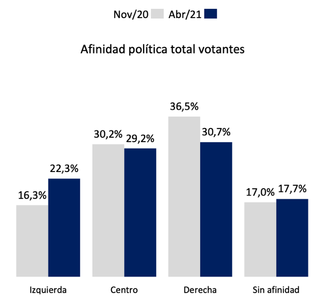 Según una encuesta liderada por Invamer, en asociación con Caracol y Blu Radio, esta transformación en la afinidad ideológica se traduce en un electorado que empieza a reconocerse cada vez menos de derecha. En un lapso de 5 meses, la afinidad política de votantes por la izquierda aumentó en prácticamente 6 puntos porcentuales, casi la misma proporción en la que cayó la afinidad por la derecha.