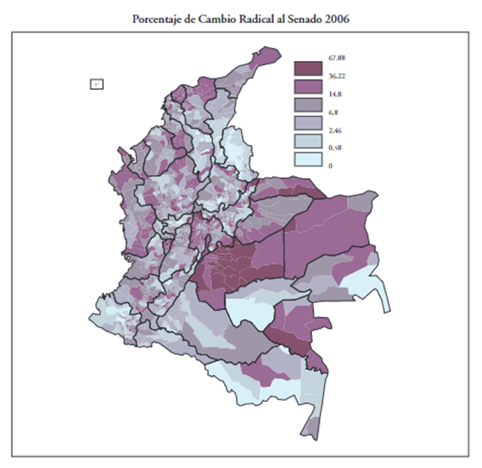 Porcentaje de Cambio Radical al Senado 2006 (en morado las zonas más votadas). Tomado de:Yann Basset