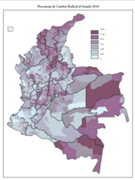 Porcentaje de Cambio Radical al Senado 2010 (en morado las zonas más votadas). Tomado de:Yann Basset