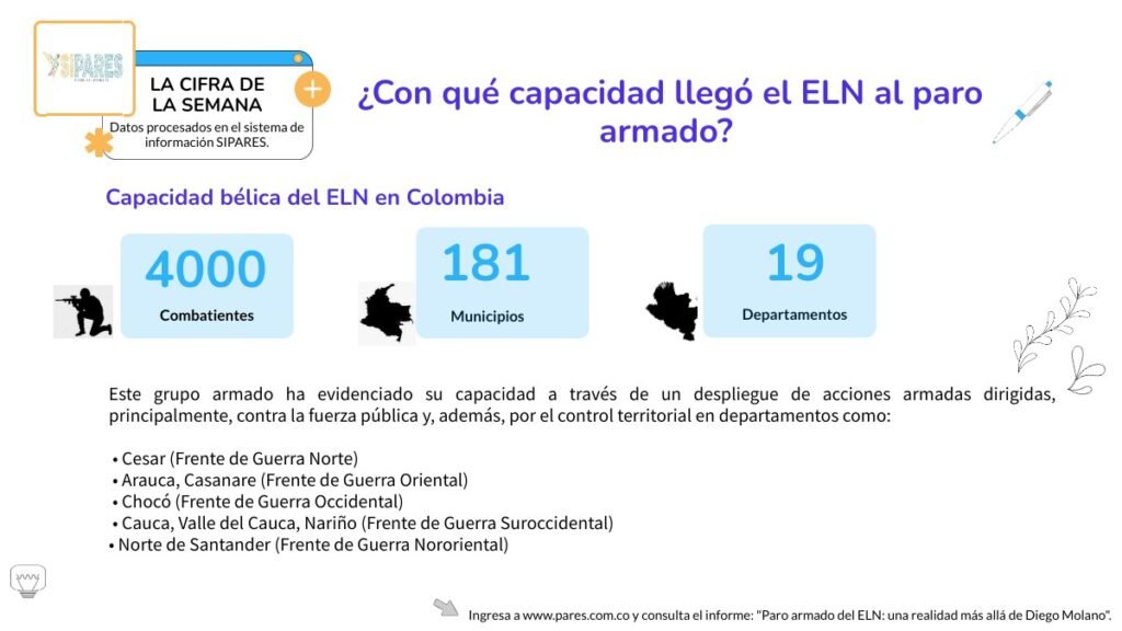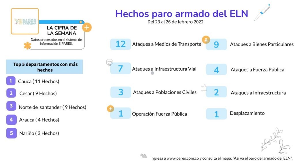 La Fundación Paz & Reconciliación (Pares) le hizo seguimiento al paro armado del ELN. Durante las 72 horas se registraron 39 hechos victimizantes, en los cuales Cauca, Cesar y Norte de Santander fueron los departamentos más afectados. Este registro demuestra la importancia de que, desde el Gobierno nacional, se tomen medidas para preservar la seguridad de los territorios.