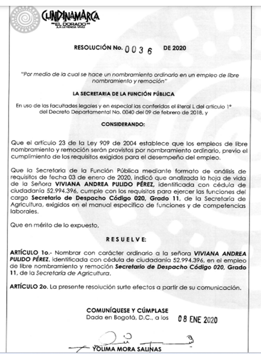 Resolución de nombramiento de Viviana Pulido como secretaria de Agricultura de Cundinamarca