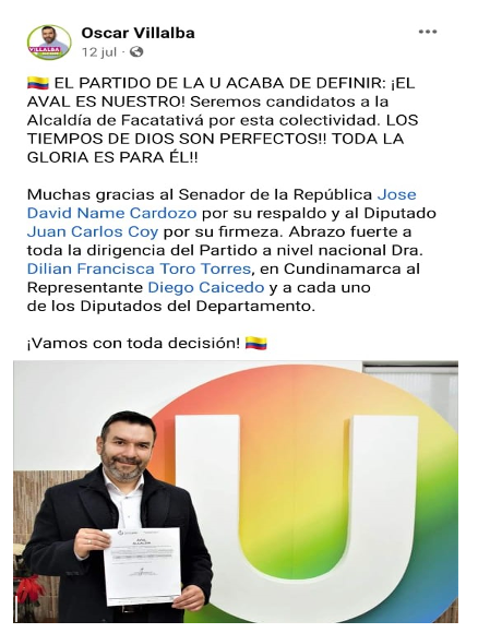 Óscar Villalba confirmando el aval del Partido de la U para sus aspiraciones
