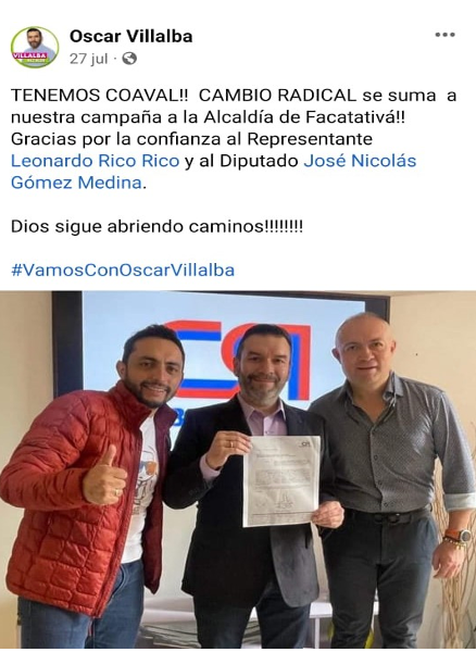Para la Alcaldía de Facatativá están apoyando a Óscar Villalba, hijo del exalcalde de este municipio, Licerio Villalba Moreno, quien fue condenado por un contrato que no cumplió los requisitos legales, por la violación al régimen de inhabilidades e incompatibilidades y por falsedad ideológica en documento público.