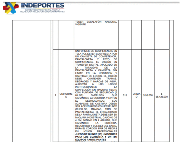Dentro de los gastos del contrato se incluye la entrega de 615 uniformes, los cuales representan la suma de $58.425.000.