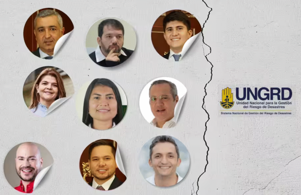 Congresistas salpicados en el caso de la UNGRD. De arriba a abajo y de izquierda a derecha:Juan Diego Muñoz (Alianza Verde);Julio Chagüí (Partido de la U);Wadith Manzur (Conservador);Liliana Bitar (Conservador);Karen Manrique (Curules de Paz);Iván Name (Alianza Verde);Julián Peinado (Liberal);Andrés Calle (Liberal);Juan Pablo Gallo (Liberal).