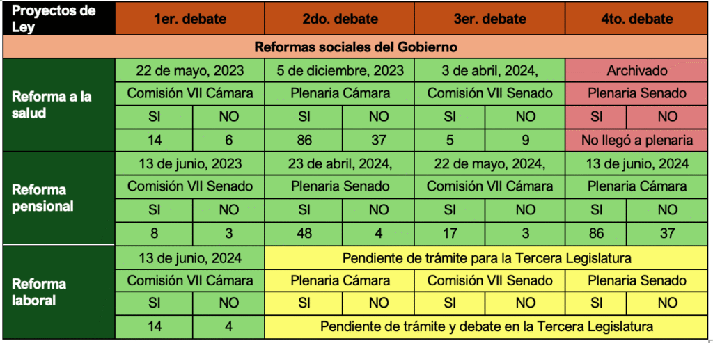 El momento más álgido de la agenda legislativa en este segundo año lo vivió el gobierno entre abril y junio de 2024, en el momento de cierre de la segunda legislatura, cuando dos de las reformas sociales que se han convertido en centrales para el gobierno tuvieron su trayecto final, en la que una terminó siendo aprobada por unanimidad en plenaria de Cámara, mientras que la otra terminó siendo archivada posterior a que un bloque de independientes y opositores le haya ganado la partida a la bancada de gobierno en Comisión Séptima de Senado.