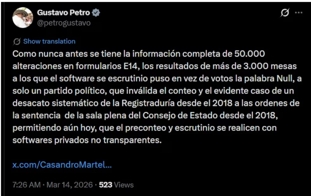 El presidente ha venido elaborando desde hace bastante tiempo la tesis sobre la plausibilidad de que hubiera fraude en este ciclo electoral en Colombia. De hecho, ya desde julio de 2025, Petro había cuestionado la idoneidad de la empresa Thomas Greg & Sons (con la que ya tiene un conflicto abierto de tiempo atrás, debido a la disputa por la impresión de pasaportes, que involucra a esta empresa) para la logística de las elecciones tanto del pasado 8 de marzo como las elecciones presidenciales de mayo y junio, al haberla señalado de fraude en el software de conteo de votos en elecciones pasadas.