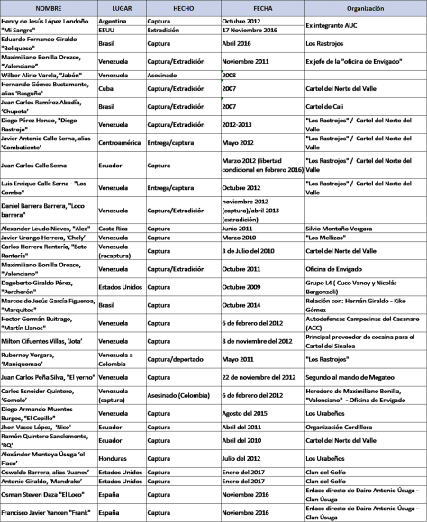 A continuación se puede ver el listado de jefes criminales colombianos de importancia que fueron capturados, abatidos o asesinados en países latinoamericanos.