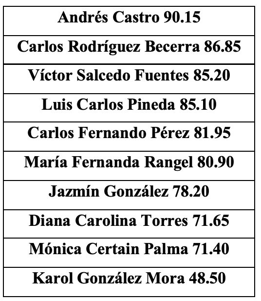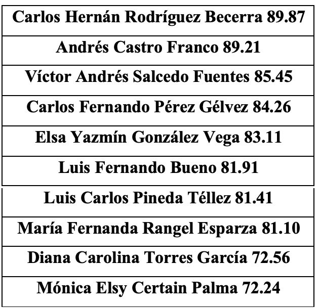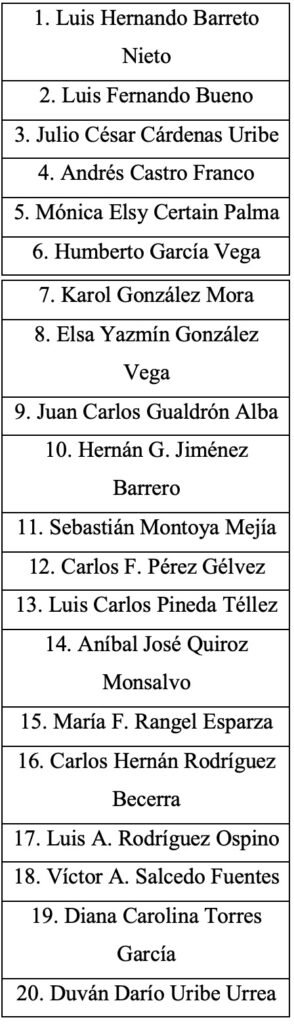 Después de este proceso, es la universidad la que entrega una lista de preselección de 20 candidatos quienes, en amparo del proceso, habían sido los mejor calificados en las pruebas aplicadas por la UIS[2] con base en los criterios de formación, experiencia profesional y publicaciones indexadas. A continuación, el listado entregado por la UIS: