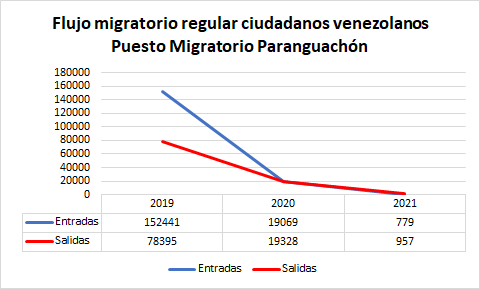 Este cambio en la dinámica de la migración se vio reflejado en las cifras de recepción y salida de todos los puestos migratorios entre Colombia y Venezuela.En el Puesto Migratorio de Paraguachón, corregimiento del municipio de Maicao, y que conecta el departamento de La Guajira con el estado de Zulia, las entradas de ciudadanos venezolanos en 2020 se redujeron en un 87,5 %, mientras que las salidas se redujeron el un 75,3 %, ambas cifras en comparación con 2019.