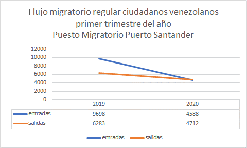 Por su parte, en el Puesto Migratorio La Unión, ubicado en Puerto Santander, Norte de Santander, municipio que colinda con el estado del Táchira en Venezuela, las cifras de flujo migratorio del primer trimestre de 2019 y 2020 presentaron una reducción en las entradas de migrantes venezolanos del 52,7%, junto con una reducción en las salidas de la misma población de un 25%. (Debido a que los datos oficiales del 2020 solo comprenden el primer trimestre del año no se puede realizar una comparación anual).