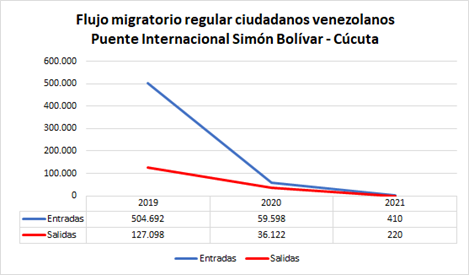 En el puesto migratorio que conecta la ciudad de Cúcuta con San Cristóbal, elPuente Internacional Simón Bolívar , la tendencia negativa es la misma. Las entradas de ciudadanos venezolanos al país durante el 2020 disminuyeron en un 88,2 %, mientras que las salidas disminuyeron en un 71,6% en comparación con 2019. Las grandes variaciones negativas en el flujo migratorio se producen después de marzo del 2020, puesto que las entradas y salidas entre enero y marzo del año pasado representaron el 99,4% de todo el flujo migratorio.