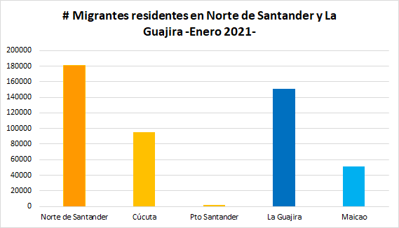 Para enero de 2021 Migración Colombia señala que, del total de migrantes venezolanos en Colombia, un 10,73% de dicha población se ubica en Norte de Santander (187.121) y un 8,65% en La Guajira (150.806). Siendo Cúcuta el tercer municipio con mayor número de migrantes en el país, al registrar 94.847, mientras en Puerto Santander se reporta la presencia de 2.186 ciudadanos venezolanos y de 51.361 en Maicao (séptimo municipio).