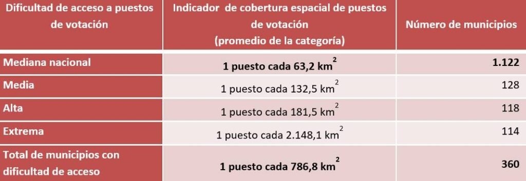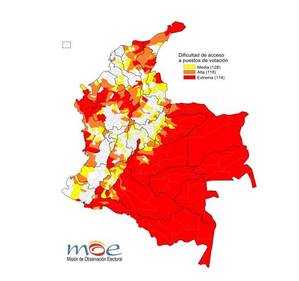 Al ritmo que vamos para esta población el reconocimiento del derecho al voto no se dará. Tres son los problemas. Primero, los puestos de votación están muy lejos de donde viven los habitantes, a veces a tres o cuatro horas de camino. El siguiente mapa elaborado por la Misión de Observación Electoral muestra las dificultades de acceso a los puestos de votación. Nótese como cada dos mil kilómetros hay un puesto de votación en las zonas de riesgo extremo.