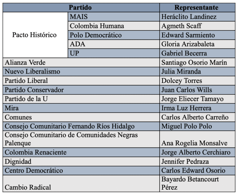 Por el Pacto Histórico estaban Alexander López, Gloria Inés Flórez, Isabel Cristina Zuleta y Clara López; por la Alianza Verde estaban Gustavo Adolfo Moreno e Inti Asprilla; por el Partido Conservador, Germán Blanco y Liliana Benavides; por el Partido Liberal, Alejandro Carlos Chacón y John Jairo Roldán; por el Partido de la U, Berner León Zambrano y Norma Hurtado Sánchez; por Comunes estaba Sandra Ramírez y por la ASI, Berenice Bedoya.