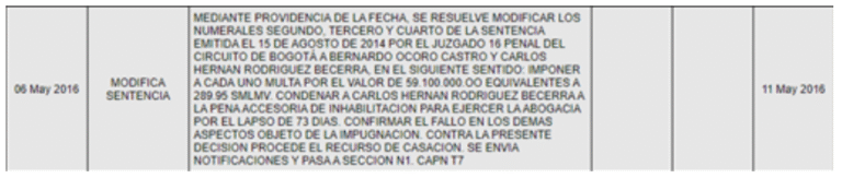 Tiene un proceso por peculado por apropiación que lo halló culpable e inhabilitó en 2016 para ejercer como abogado por 9 meses, aunque no se pudo consultar el motivo, al que habría que sumarle otro proceso penal con número 52835310400219950722601, por falsedad, hurto y abuso de confianza y que se resolvió en etapa de casación.