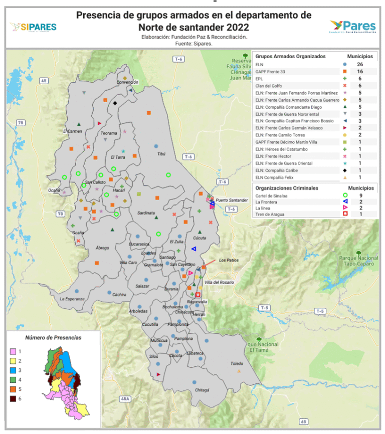 Sin embargo, Arauca no es la única geografía violenta, a este departamento se suma Norte de Santander, un departamento el cual históricamente ha sido marcado por su influencia por parte de grupos armados ilegales como el ELN, que, según la Defensoría del Pueblo, actualmente hace presencia en 40 municipios del departamento. Aunque el ELN no es el único grupo armado ilegal que hace presencia en el departamento, otros como el Grupo Armado Pos FARC Frente 33, el EPL, el Clan del Golfo, entre otros, también combaten por el control del territorio.