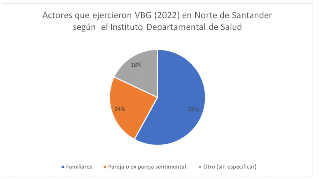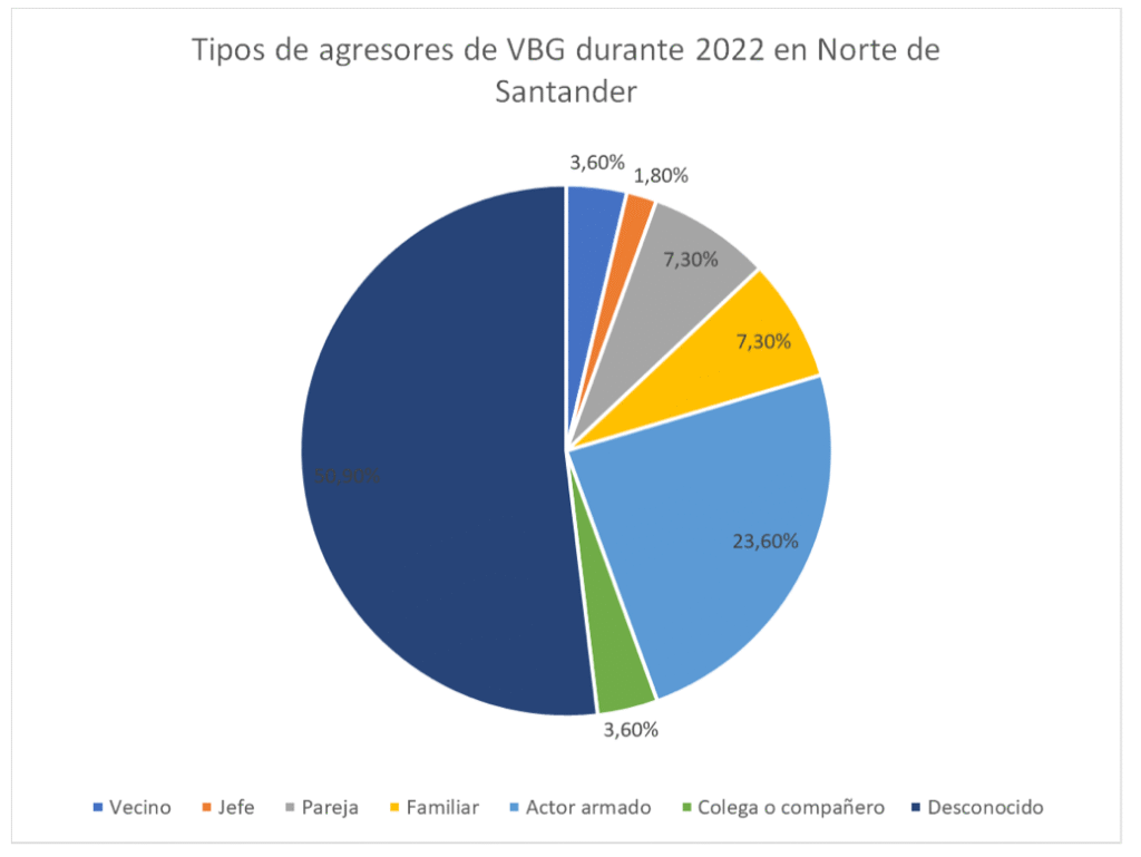 Según el monitoreo de medios de comunicación realizado por esta organización para el informe, el 23,6% de los agresores de violencia basada en género (VGB) durante 2022 en Norte de Santander fueron los actores armados. El centro de investigación destacó que el Instituto Nacional de Medicina Legal y Ciencias Forenses (INMLCF) y el Instituto Departamental de Salud (IDS) no estandarizan los tipos de agresores y no precisan cuántos corresponden a las EAI, mientras que el Departamento de Policía de Norte de Santander y la Fiscalía General de la Nación no cuentan con una clasificación de los victimarios en el departamento.