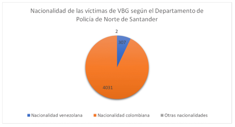 Según las cifras del Departamento de Policía de Norte de Santander, de las 4.408 víctimas del 2022, 307 tienen nacionalidad venezolana, 4.031 colombiana y dos otras nacionalidades. Por su parte, el IDS registró 3.832 casos de VBG, de los cuales 327 corresponden a personas nacidas en Venezuela y 3.505 a nacidas en Colombia.