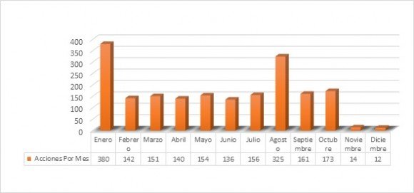 Nótese como enero y agosto fueron los meses más violentos con más de 300 acciones cada uno y en los demás meses la tendencia fue bastante similar a excepción de los últimos dos meses cuando se declaró la tregua Unilateral. Esta cifra de enero y agosto llama la atención, pues es la primera vez que se superan las 300 acciones por mes en la última década.