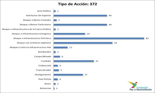 Dos cosas se deben destacar de la anterior gráfica. Por un lado, los más de 100 ataque a la infraestructura económica del país. (83 acciones contra la infraestructura petrolera, 29 energética y 13 contra la infraestructura vial). Desde el año 2008 las FARC adoptaron este tipo de ataques como una estrategia militar, e incluso, crearon las famosas comisiones de mineros, comandos especializados en este tipo de ataques. Lo segundo, es la reducción importante de los combates, las FARC cada vez combaten menos y se dedican más a la guerra de guerrillas.