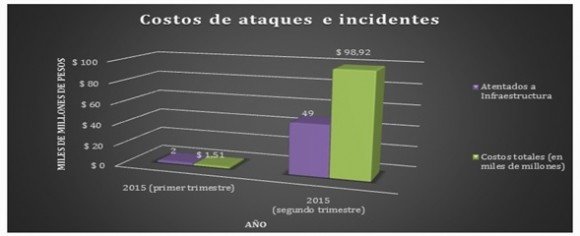 Durante el segundo trimestre del año e incluido los primeros días de julio los costos en el sector por las acciones suman cerca de $101.700 millones de pesos (en los cuales se incluye reparaciones, descontaminaciones, y pérdida de crudo). Durante el primer trimestre la cifra fue bastante baja como se ve en la anterior gráfica. Este año el sector ha perdido más de 100.000 barriles lo que equivale a $14.560 millones en pérdidas de ingresos por venta de crudo. Dicho datos salen del informe publicado el 16 de julio del 2015 por la Cámara Colombiana de Bienes y Servicios Petroleros.