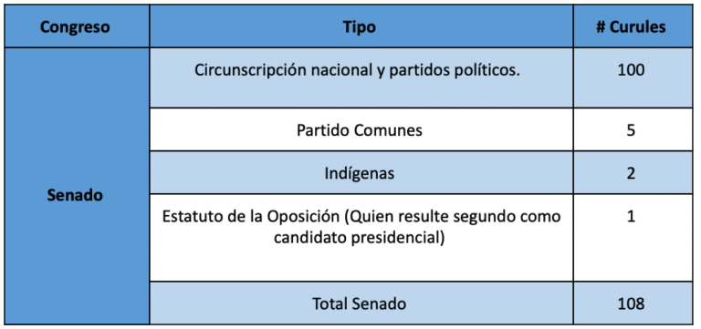 • 107 senadores y senadoras elegidos el 13 de marzo, y una (1) curul adicional en Senado reservada, según el estatuto de la oposición, al candidato presidencial que resulte segundo en la elección.