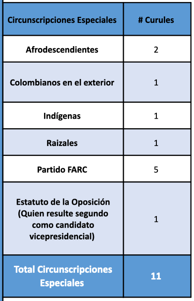• 187 representantes a la Cámara elegidos el 13 de marzo, y una (1) curul adicional en Cámara de representantes reservada, según el estatuto de la oposición, al candidato vicepresidencial que resulte segundo en la elección. Cabe resaltar que esta será la primera vez en la que se escogerán 16 curules en las Circunscripciones Transitorias Especiales de Paz (CITREP).