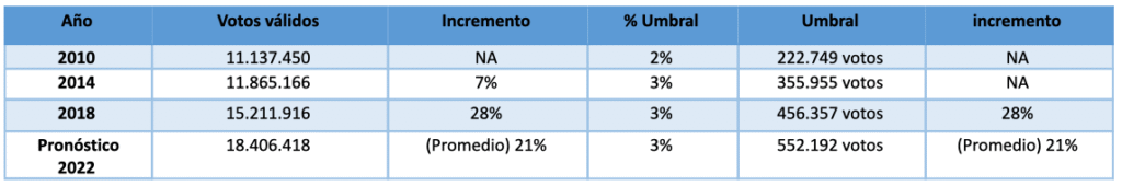 Retomando el análisis del umbral para 2022, si se tienen en cuenta las últimas 3 elecciones a Congreso, para este año el umbral estaría aproximadamente en 552 mil votos y los votos válidos estarían por el orden de los 18.406.418, con un censo electoral de 38.819.901 posibles votantes.