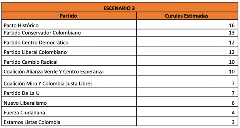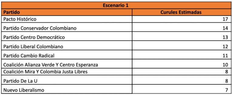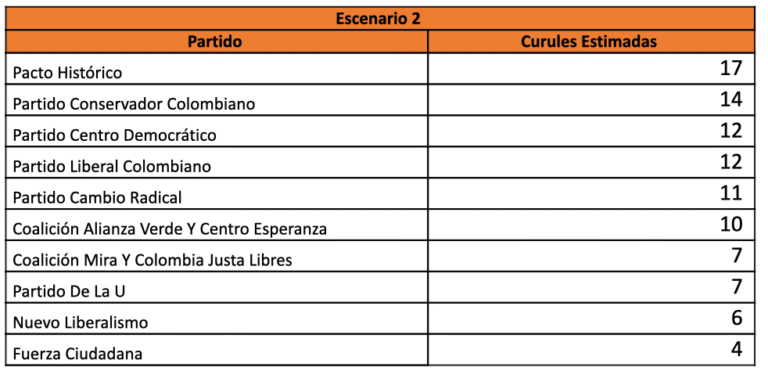 Escenario 1 Partido Curules Estimadas Pacto Histórico 17 Partido Conservador Colombiano 14 Partido Centro Democrático 13 Partido Liberal Colombiano 12 Partido Cambio Radical 11 Coalición Alianza Verde Y Centro Esperanza 10 Coalición Mira Y Colombia Justa Libres 8 Partido De La U 8 Nuevo Liberalismo 7