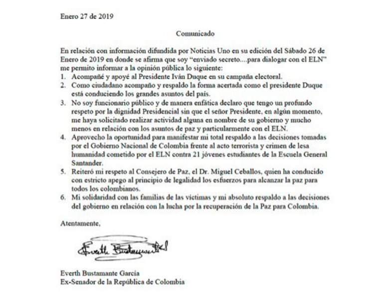 “Conocida por el Gobierno Nacional la intención del Señor Everth Bustamante García de viajar a la isla de Cuba por decisión, cuenta y riesgo propios, el alto Comisionado para la Paz se permite certificar que no concedió ninguna autorización al señor Bustamante García para actuar ni interlocutar con el ELN en nombre del Gobierno Nacional, en materias relacionadas con eventuales diálogos de paz que son de su exclusiva competencia, circunstancia que ha sido reconocida públicamente por el propio ex senador de la República”, aseguró Ceballos en un comunicado. Everth Bustamante, por su parte, respondió a la situación con este comunicado: