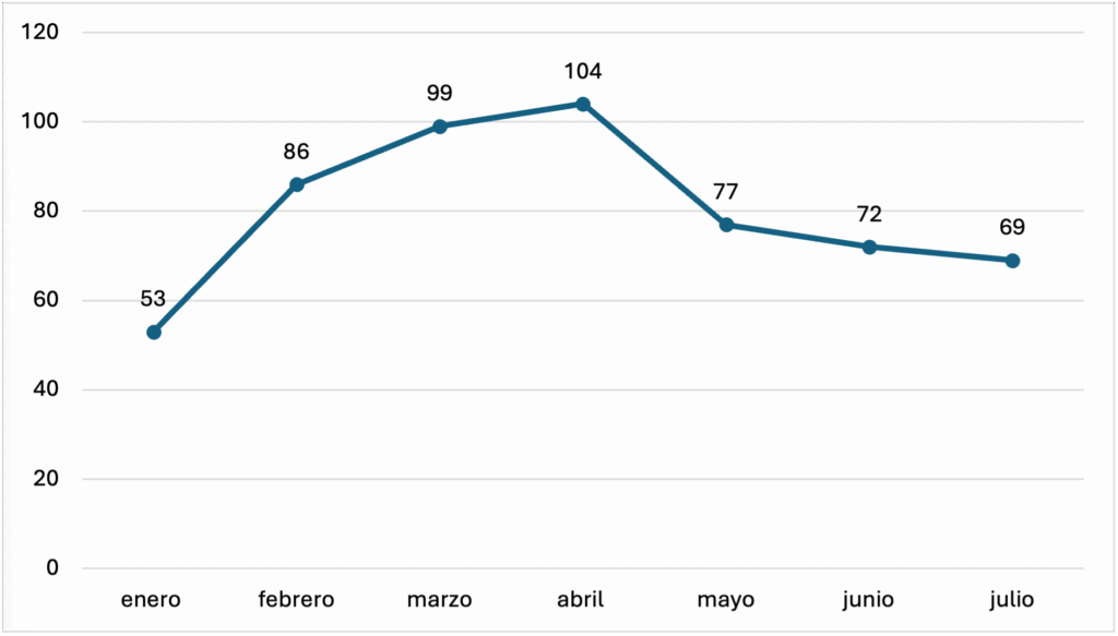 La lectura por meses ayuda a entender el pulso. Tras los 53 de enero, vinieron 86 en febrero, 99 en marzo y un máximo de 104 en abril; luego, 77 en mayo, 72 en junio y 69 en julio. Es decir, el rebote no aumentó del todo: se sostuvo durante un trimestre y empezó a ceder sin regresar al piso de enero. Esta curva podría sugerir que, cuando los ceses se debilitan, los actores reacomodan rápidamente su despliegue y, una vez resituados en corredores y enclaves, administran la intensidad de la coerción según su agenda económica.