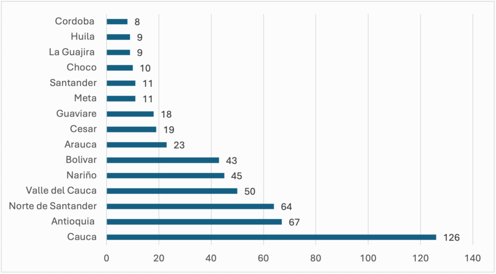 Ilustración 1. Afectaciones por departamento Enero -Julio 2025. Fuente: Ministerio de Defensa. Elaborado por: Fundación Paz & Reconciliación.