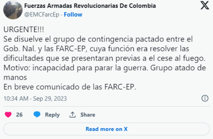 El pasado viernes 29 de septiembre,el Estado Mayor Central (EMC)público a través de su cuenta de X la posible disolución del grupo de contingencia pactado conel Gobierno Nacional, cuya función seríaresolver las dificultades que se presentaran previas al cese al fuego.Según se publicó en su cuenta, dicho grupo se disolvería debido acciones contraofensivas del Gobiernoque generan“incapacidad de parar la guerra”.