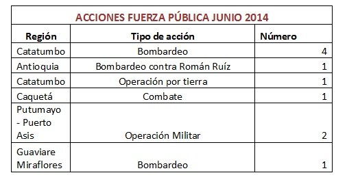 Las FARC -EP en el marco del actual proceso de paz han anunciado cuatro treguas unilaterales. La cuarta tregua se desarrolló entre el 9 de junio y el 30 de junio de 2014. En este periodo se realizaron 11 acciones armadas, 10 por iniciativa de la fuera pública y una por parte de las FARC- EP, decir solo hubo una acción violatoria de la tregua. El éxito de esta tregua nuevamente está cercano al 97%. El siguiente cuadro muestra el total de acciones de la Fuerza Pública durante los días de la tregua.