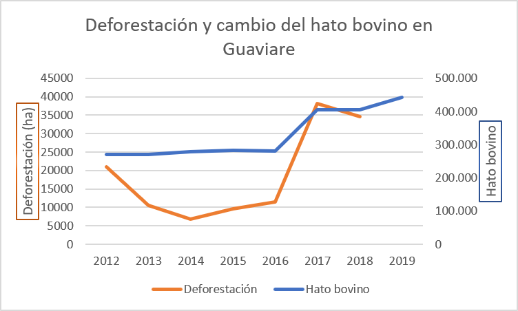 Entre 2012 y 2016 la cantidad de vacas en el departamento fue más o menos constante. En estos años la deforestación se encontró entre 7000 (2014) y 21.000 hectáreas (2012). En 2017 hay un aumento brusco en ambas: la deforestación aumentó un 233% y el hato bovino un 44%.