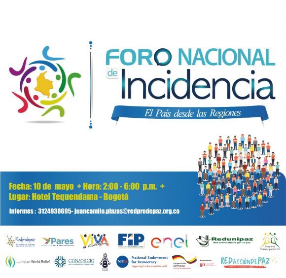 El jueves 10 de mayo de 2 a 6 de la tarde, con el fin de compilar la agenda territorial, representantes de las regiones del país se reunirán en un foro para exponer los asuntos más importantes que los aquejan. El evento está convocado por la RedprodePaz, la Fundación Paz y Reconciliación-Pares, Viva la ciudadanía, Fundación Ideas para la Paz (FIP), ENEL, Redunipaz, Programa Puentes para la paz, Consorcio para el Desarrollo Comunitario, Corporación alemana, Fundación mi sangre, Lutheran World Relief y National Endowment for Democracy.