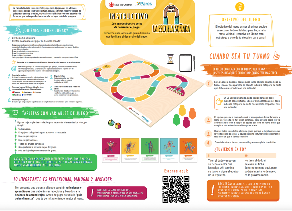 La Escuela Soñada es un juego pedagógico para imaginar y construir escuelas más seguras y en paz. Incluye un tablero, fichas de colores, dado, reloj de arena y cartas con retos para actuar, dibujar, pensar y crear soluciones en equipo. Cada color representa una categoría del juego: Teatrero, Palabrero, Garabatero, Sabelotodo y Estratega. A través de sus actividades, los jugadores reflexionan sobre la convivencia, la protección y la respuesta ante riesgos escolares.