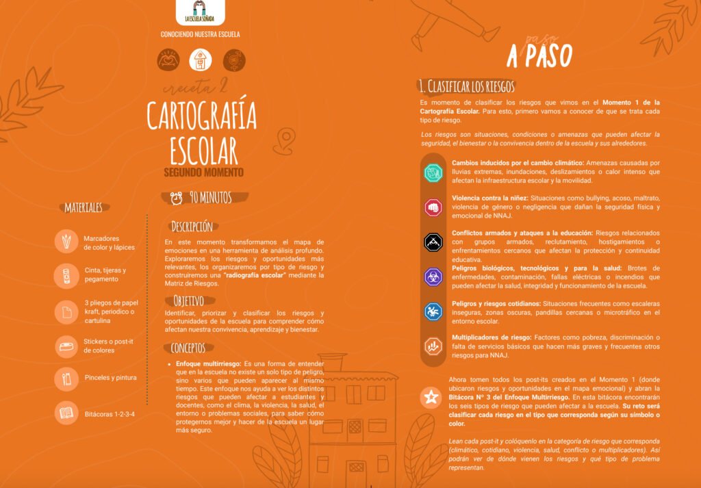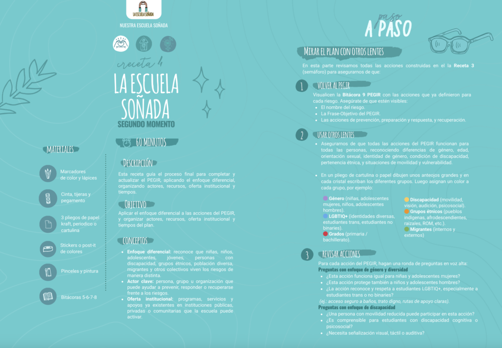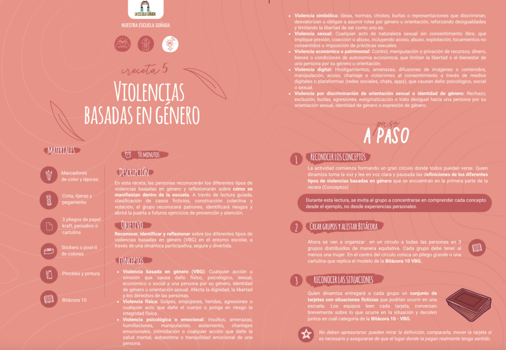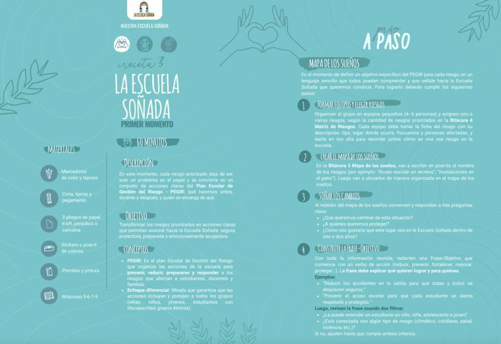 El Recetario de La Escuela Soñada es una guía práctica con actividades y metodologías para fortalecer la convivencia, la protección y la participación en la escuela. Contiene “recetas” paso a paso con materiales, tiempos y roles que ayudan a reflexionar, planear y actuar frente a los riesgos escolares. Cada receta propone dinámicas creativas para trabajar en grupo, aprender haciendo y construir juntos entornos seguros y solidarios.