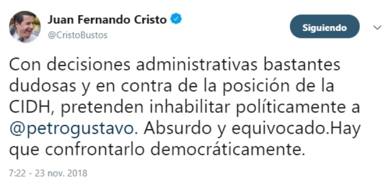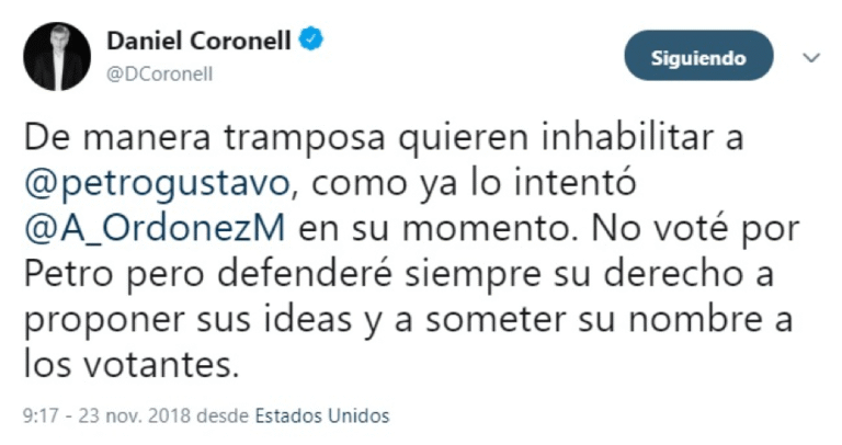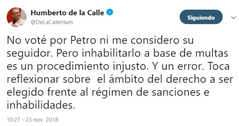 Quiroga también le dijo a ese medio que«salvo que la Presidencia del Senado llegara a tomar una medida atrabiliaria» , la única forma de que Petro dejara su lugar en el Parlamento sería una demanda de pérdida de investidura ante el Consejo de Estado. Además, sumada a la medida cautelar impuesta a favor de Petro por el Tribunal de Cundinamarca, el senador también tenía una impuesta por el mismo Consejo de Estado mientras revisa una de las condenas impuestas por la Contraloría Distrital.